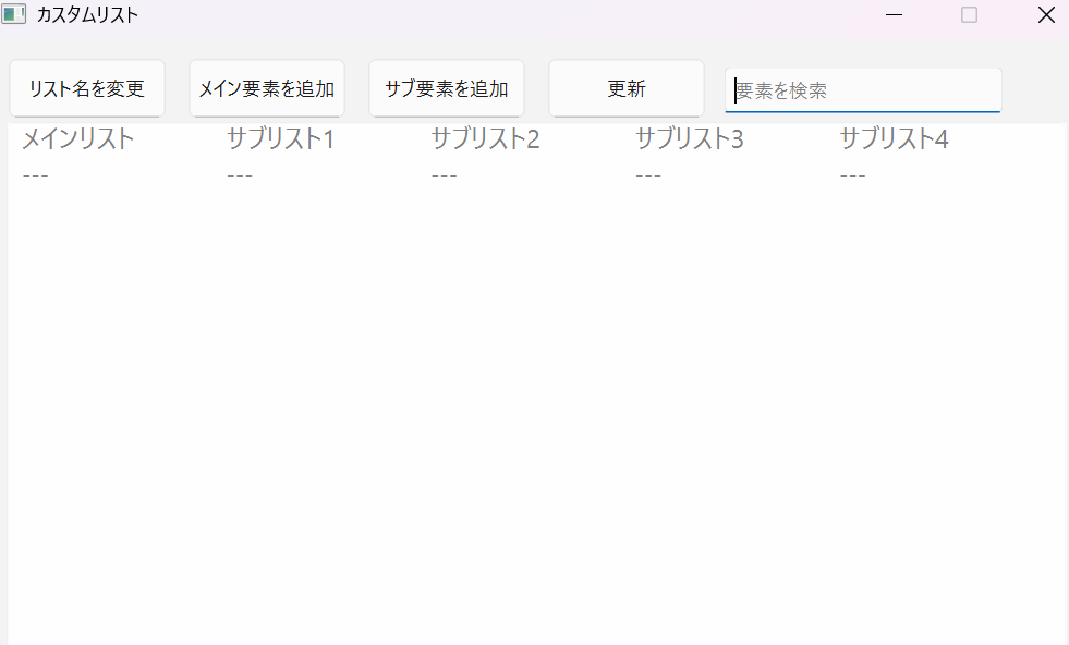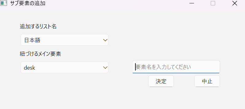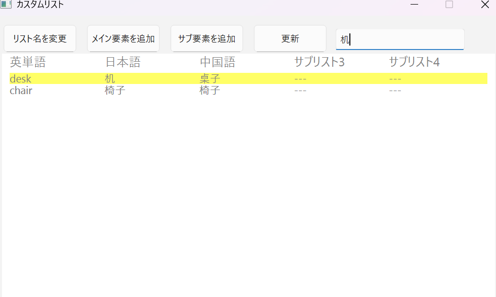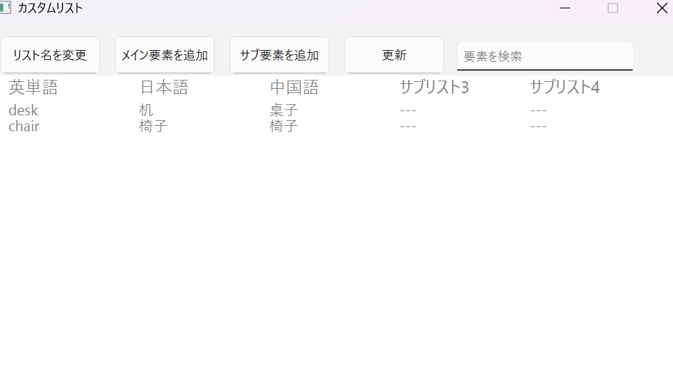 2025年の2月ごろに、pythonのpyside6モジュールを使用して約10時間で作成したアプリ。自分で好きなようにリストの名前を変えられ、使い方次第で様々な用途で使用できる汎用性の高いアプリである。使用方法は、まず「リスト名を変更」ボタンを押してメインとサブそれぞれのリスト名を設定する。その後、それぞれに要素を追加していく。メイン要素とサブ要素を紐づけることで、検索欄でヒットした要素と紐づいた要素がまとめて強調表示される。写真のように勉強で使用したり、ゲームの情報をまとめたりと様々な用途で使用できる。