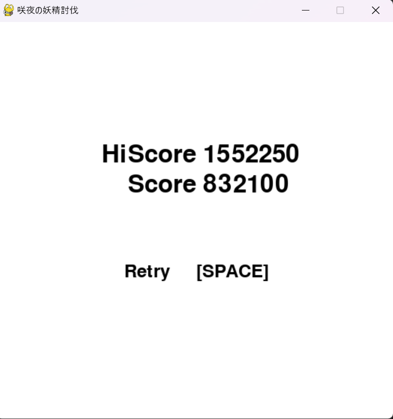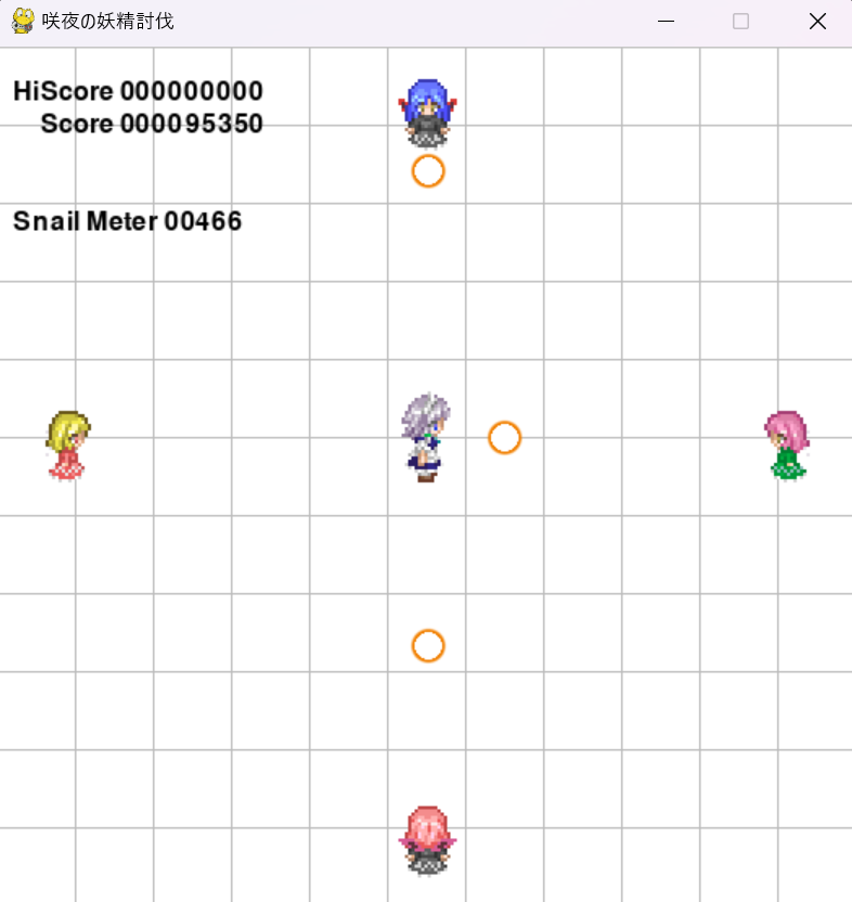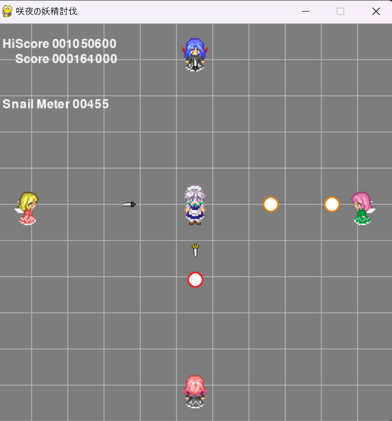 2025年の1月ごろに、pythonのpygameモジュールを使用して作成したゲーム。東方projectの十六夜咲夜というキャラクターが4方向からの妖精の攻撃を投げナイフで防ぐという内容の二次創作ゲームである。操作方法は、WASDキーで中央のキャラクターの向きを変え、左クリックでナイフを投げるというシンプルなものに加え、右クリックでスネイルという特殊能力を使用できる。この能力は、妖精の攻撃速度や攻撃頻度を遅くするというもので、この能力を駆使することで、より長い時間攻撃を耐えることができる。時間経過や妖精の攻撃を防ぐことでスコアが加算されていく。連続でプレイするとハイスコアを記録することができるので、一人でやりこむことができる。