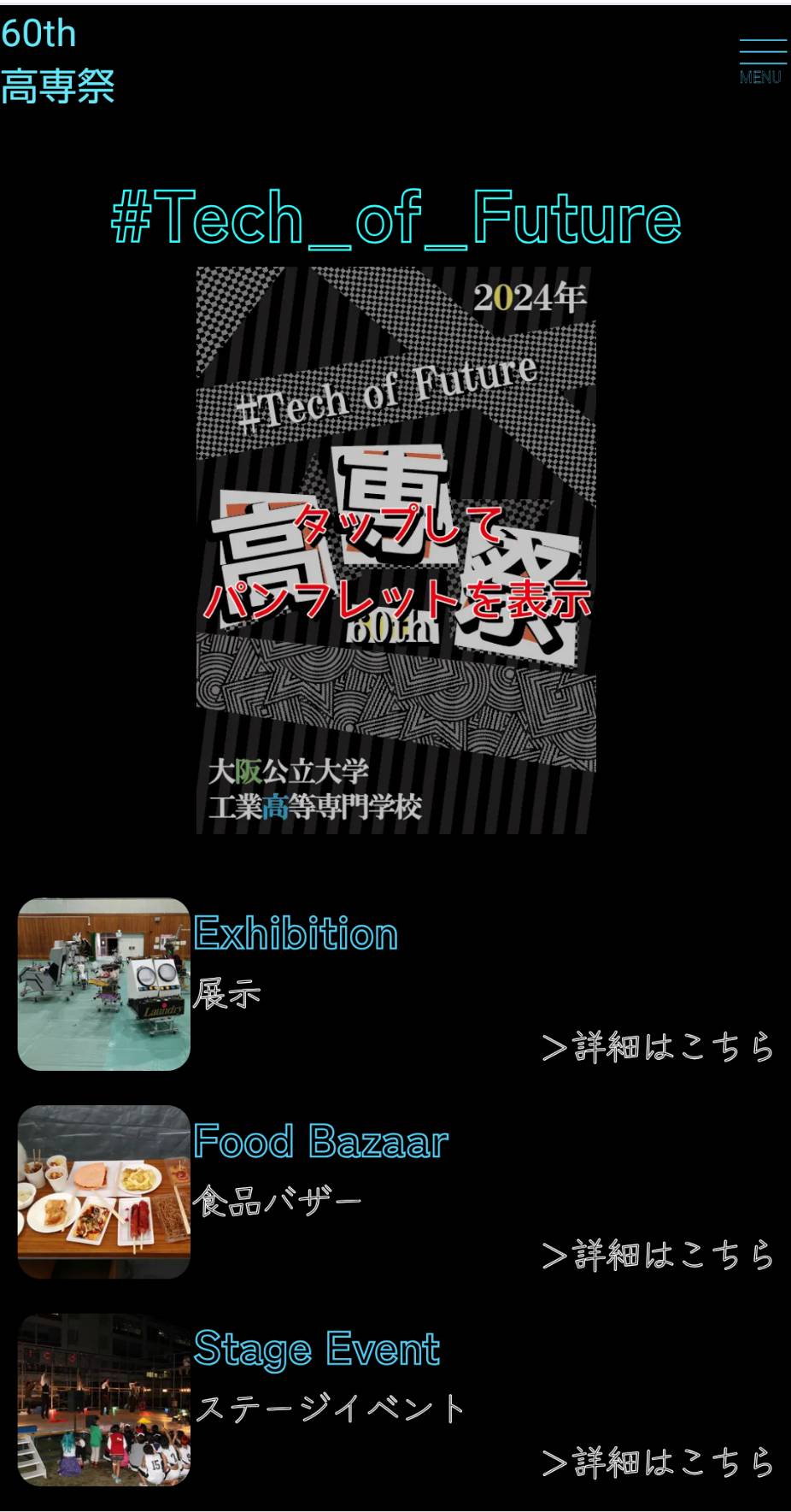 第60回公立大高専祭の際に作成した特設サイト。7人のチームで作成し、Typescriptを使用した。高専祭の展示や食品バザーがまとめてあるページ、ステージイベントの一覧が見られるページなどがある。私は一部のコンポーネント作成とレイアウトの調整を 担当した。