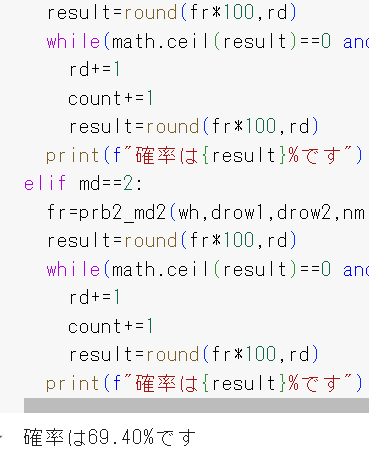 google colabで作成した確率計算機。二種類を同時に引く確率や、1種類目を引いたときに追加で何枚か引いて二種類がそろう確率といった、カードゲームをする人が欲しい確率を求めることができる。